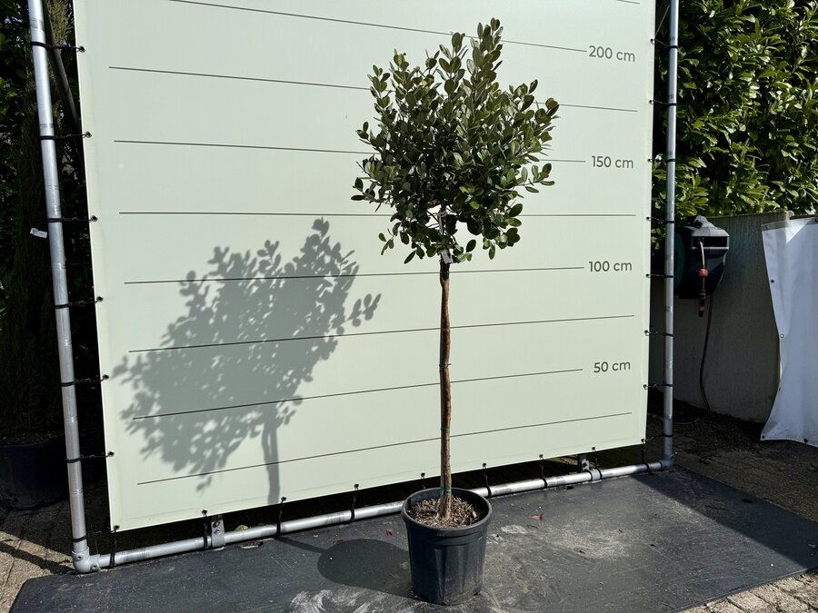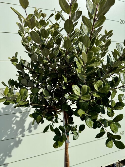 De Feijoa ‘Acca sellowiana’, ook wel bekend als ananasguave, is een groenblijvende sierboom in bolvorm op stam. De plant heeft prachtig grijsgroen blad met een zilverachtige onderzijde, wat zorgt voor een luxe uitstraling. In het voorjaar bloeit de Feijoa met opvallende wit-roze bloemen met rode meeldraden. Bij voldoende zon en warmte kunnen er zelfs eetbare vruchten ontstaan. Door de bolvorm op stam is deze plant zeer geschikt voor terrassen, patio’s en als stijlvolle blikvanger in de tuin. Winterhard De Ananasguave doet het erg goed in ons klimaat en is winterhard tot -12. Bij strenge vorst moet de Ananasguave tijdig beschermt worden of weggezet worden. Standplaats Ananasguave De Ananasguave houdt van een zonnige en beschutte plek in de tuin. Als de boom in de ochtend schaduw heeft is dit geen probleem. Onderhoud Ananasguave De Ananasguave heeft weinig onderhoud nodig. Het is alleen belangrijk om te zorgen dat de boom niet helemaal uitdroogt. Waterbehoefte De Ananasguave heeft een gemiddelde waterbehoefte. Het is belangrijk om de boom niet te laten uitdrogen. Door regelmatig je vinger goed in de aarde steken merk je snel of de boom te droog of te nat staat. Snoeien De Ananasguave hoeft eigenlijk niet gesnoeid te worden. Als je hem toch meer in model wilt snoeien kun je dit het beste in het voorjaar doen. Voeding Extra voeding bevordert de groei van de Ananasguave en geeft een mooie kleur aan het blad. De Ananasguave heeft alleen voeding nodig in het groeiseizoen van maart t/m oktober. Wij adviseren om deze voeding te gebruiken. Kwaliteitsgarantie Tropictrees selecteert zijn planten zelf bij de kweker. Kwaliteit en leveringsbetrouwbaarheid staan bij ons centraal. Het blijft een natuurproduct waardoor het altijd iets kan afwijken van de foto’s. Wij zijn geregistreerd bij NAK Tuinbouw onder nr. 91500