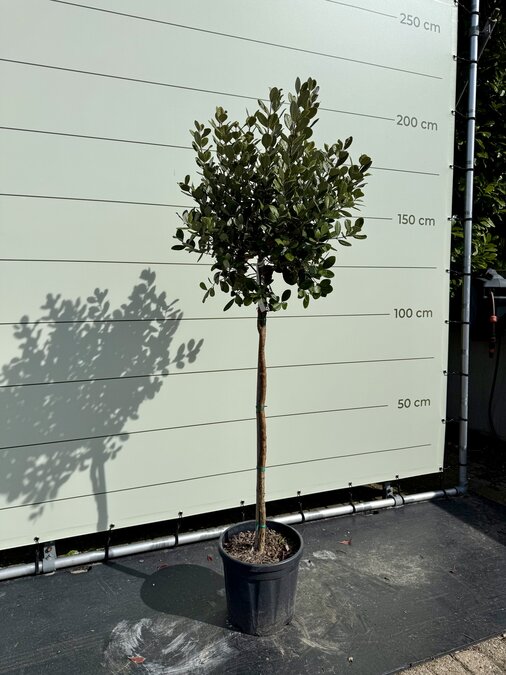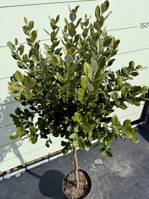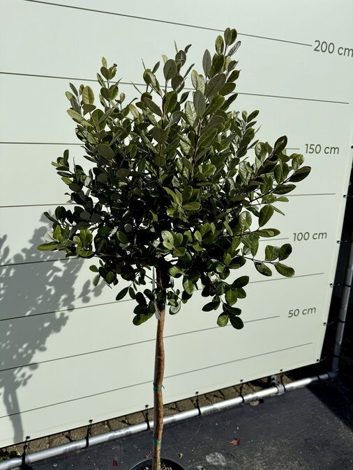 Deze bijzondere Feijoa Acca sellowiana, ook bekend als Ananas Guave is een groenblijvende bol op stam van ca. 175 cm waar mooie witte bloemen uitkomen.