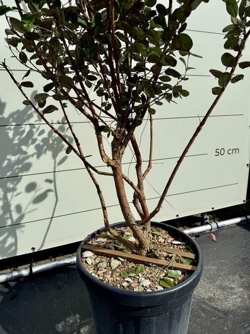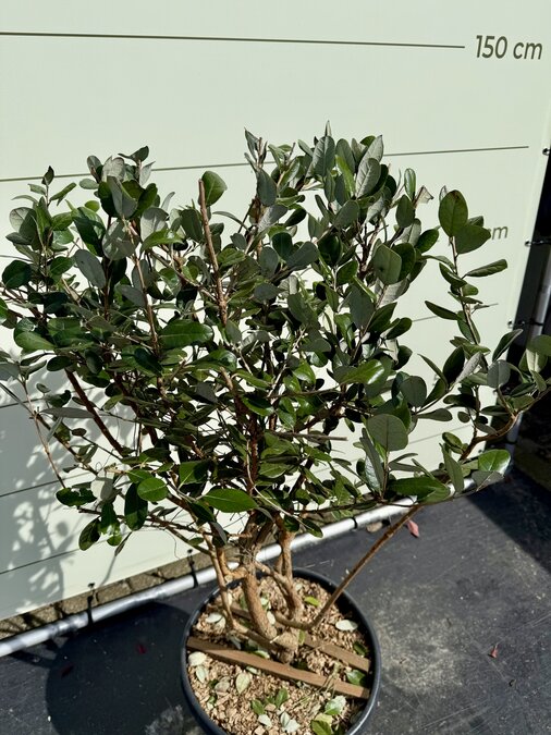 De Feijoa ‘Acca sellowiana’, ook wel bekend als ananasguave, is een groenblijvende sierboom. De plant heeft prachtig grijsgroen blad met een zilverachtige onderzijde, wat zorgt voor een luxe uitstraling. In het voorjaar bloeit de Feijoa met opvallende wit-roze bloemen met rode meeldraden. Bij voldoende zon en warmte kunnen er zelfs eetbare vruchten ontstaan. Door de bolvorm op stam is deze plant zeer geschikt voor terrassen, patio’s en als stijlvolle blikvanger in de tuin. Winterhard De Ananasguave doet het erg goed in ons klimaat en is winterhard tot -12. Bij strenge vorst moet de Ananasguave tijdig beschermt worden of weggezet worden. Standplaats Ananasguave De Ananasguave houdt van een zonnige en beschutte plek in de tuin. Als de boom in de ochtend schaduw heeft is dit geen probleem. Onderhoud Ananasguave De Ananasguave heeft weinig onderhoud nodig. Het is alleen belangrijk om te zorgen dat de boom niet helemaal uitdroogt. Waterbehoefte De Ananasguave heeft een gemiddelde waterbehoefte. Het is belangrijk om de boom niet te laten uitdrogen. Door regelmatig je vinger goed in de aarde steken merk je snel of de boom te droog of te nat staat. Snoeien De Ananasguave hoeft eigenlijk niet gesnoeid te worden. Als je hem toch meer in model wilt snoeien kun je dit het beste in het voorjaar doen. Voeding Extra voeding bevordert de groei van de Ananasguave en geeft een mooie kleur aan het blad. De Ananasguave heeft alleen voeding nodig in het groeiseizoen van maart t/m oktober. Wij adviseren om deze voeding te gebruiken. Kwaliteitsgarantie Tropictrees selecteert zijn planten zelf bij de kweker. Kwaliteit en leveringsbetrouwbaarheid staan bij ons centraal. Het blijft een natuurproduct waardoor het altijd iets kan afwijken van de foto’s. Wij zijn geregistreerd bij NAK Tuinbouw onder nr. 91500