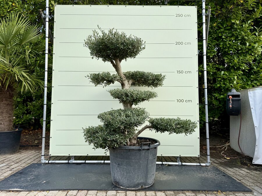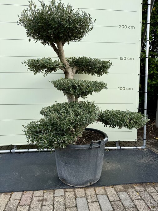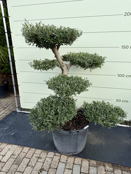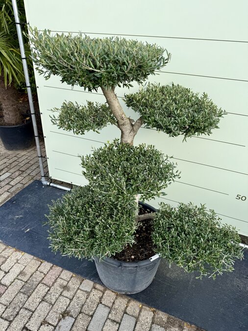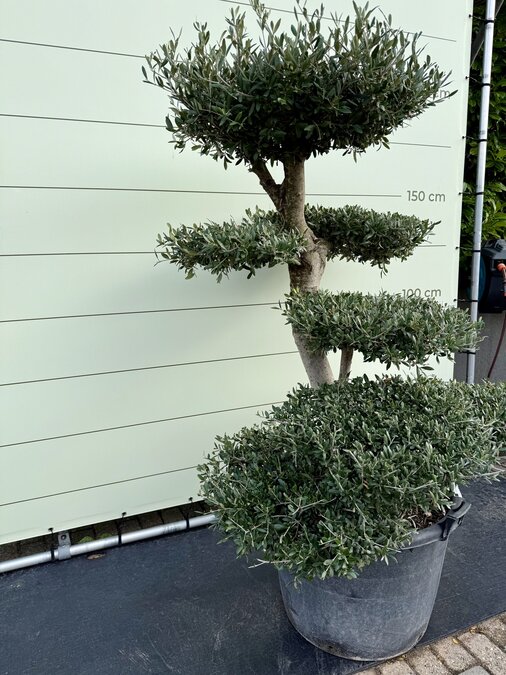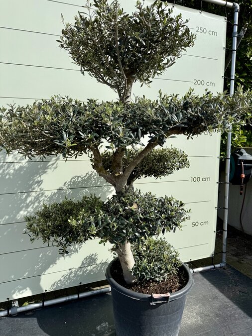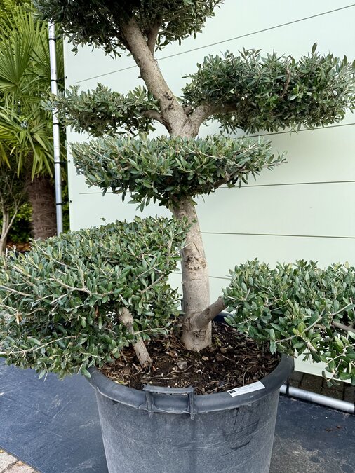 Een Olijfboom Pon-Pon kopen voor in de tuin? Deze olijfboom is afkomstig uit de olijffamilie “Oleaceae” en staat bekend om zijn speelse uiterlijk. De olijfboom wordt gekenmerkt door zijn verschillende plateaus en is winterhard. Hij is dus uitermate geschikt voor het Nederlandse klimaat en houdt van een zonnige plek in de tuin. Winterhard De olijfboom is winterhard in de volle grond tot -18 en in pot tot -10. De olijfbomen moeten tijdig afgedekt worden zodat er geen vorstschade ontstaat. Dit kun je eenvoudig doen door het aanbrengen van een winterhoes. Standplaats Olijfboom (Olea Europaea) De olijfboom heeft veel behoefte aan zon en licht. De beste standplaats voor een olijfboom is dan ook in de volle zon. De olijfboom moet wel genoeg water krijgen; het is daarom belangrijk dat de grond altijd licht vochtig is zodat de olijfboom niet uitdroogt. Deze olijfboom kan dan ook alleen buiten neergezet worden en is niet voor binnen bedoeld. Onderhoud Olijfboom Een olijfboom heeft wel wat onderhoud nodig om hem goed te laten groeien en om hem in model te houden. Waterbehoefte De olijfboom heeft een gemiddelde waterbehoefte, ook is het belangrijk dat de olijfboom niet uitdroogt. Een teken van te weinig water is dat het blad begint te krullen, dit blad zal uiteindelijk ook afvallen. Bij teveel water wordt het blad geel/bruin, dit blad valt uiteindelijk ook af. Door regelmatig je vinger goed in de aarde te steken kun je goed merken of de grond te droog of te nat is. Snoeien Een olijfboom kan in het voorjaar het beste gesnoeid worden. Het snoeien van een olijfboom heeft twee grote voordelen. Ten eerste blijft de olijfboom mooi en krijgt die weer een mooie vorm. Ten tweede is het ook erg goed voor de olijfboom. Door het snoeien van de takken hoeft de olijfboom minder energie te verspreiden en verbetert het de vitaliteit van de boom. Het snoeien van de boom doe je door dode takken weg te knippen en de uitlopers aan de bovenkant van het plateau weer terug te snoeien. Hierdoor krijg je weer strakke plateaus, dit kan eventueel in de zomer nogmaals gedaan worden. Voeding Extra voeding bevordert de groei van de olijfboom en geeft een mooie kleur aan het blad. De olijfboom heeft alleen voeding nodig in het groeiseizoen van maart t/m oktober. Wij adviseren om deze voeding te gebruiken. Kwaliteitsgarantie Tropictrees selecteert zijn planten zelf bij de kweker. Kwaliteit en leveringsbetrouwbaarheid staan bij ons centraal. Het blijft een natuurproduct waardoor het altijd iets kan afwijken van de foto’s. Wij zijn geregistreerd bij NAK Tuinbouw onder nr. 91500